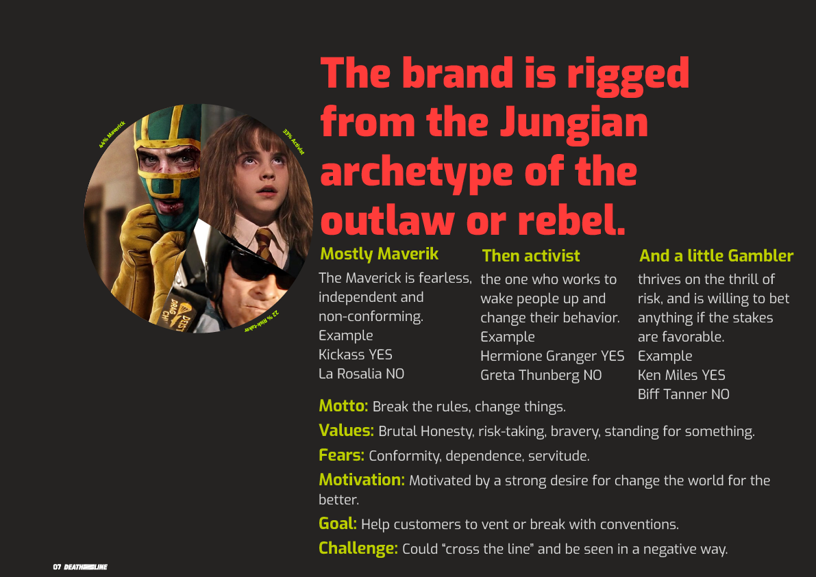 Customers interacting with the brand feel inspired to take the leap, to be bigger and stronger, to seek to leave a legacy and significant changes. Therefore, those who are focused on idealistic goals and are willing to take risks or look for different ways of doing things will identify with the brand. On the contrary, customers who seek continuity and security will not connect so easily with the brand values, for this type of customers it is necessary to have a different communication strategy, perhaps creating a satellite brand or with intermediary allies, as long as the core of the brand does not have to be changed to pursue a prospect.