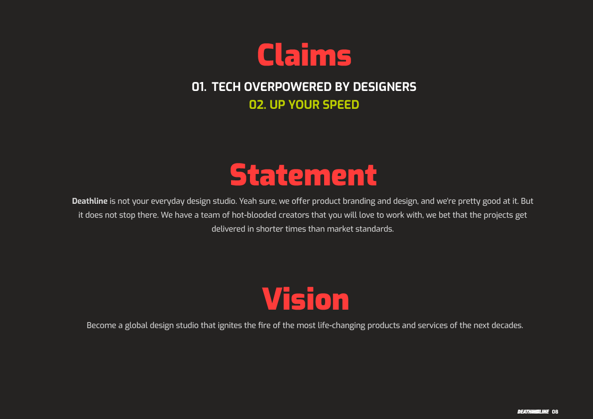 Deathline is not your everyday design studio. We offer product branding and design, and we're pretty good at it. But it does not stop there. We have a team of hot-blooded creators that you will love to work with, we bet the projects get delivered in shorter times than market standards.